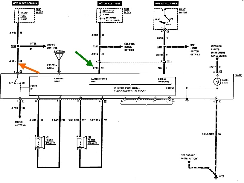 Next would be to remove the radio, then measure the two power supply voltages. Best is to leave the connectors plugged in, and back-probe through the back of the plugs next to the wires. You should find 12 volts on the green wire all the time. 12 volts should be on the yellow wire only when the ignition switch is turned on.