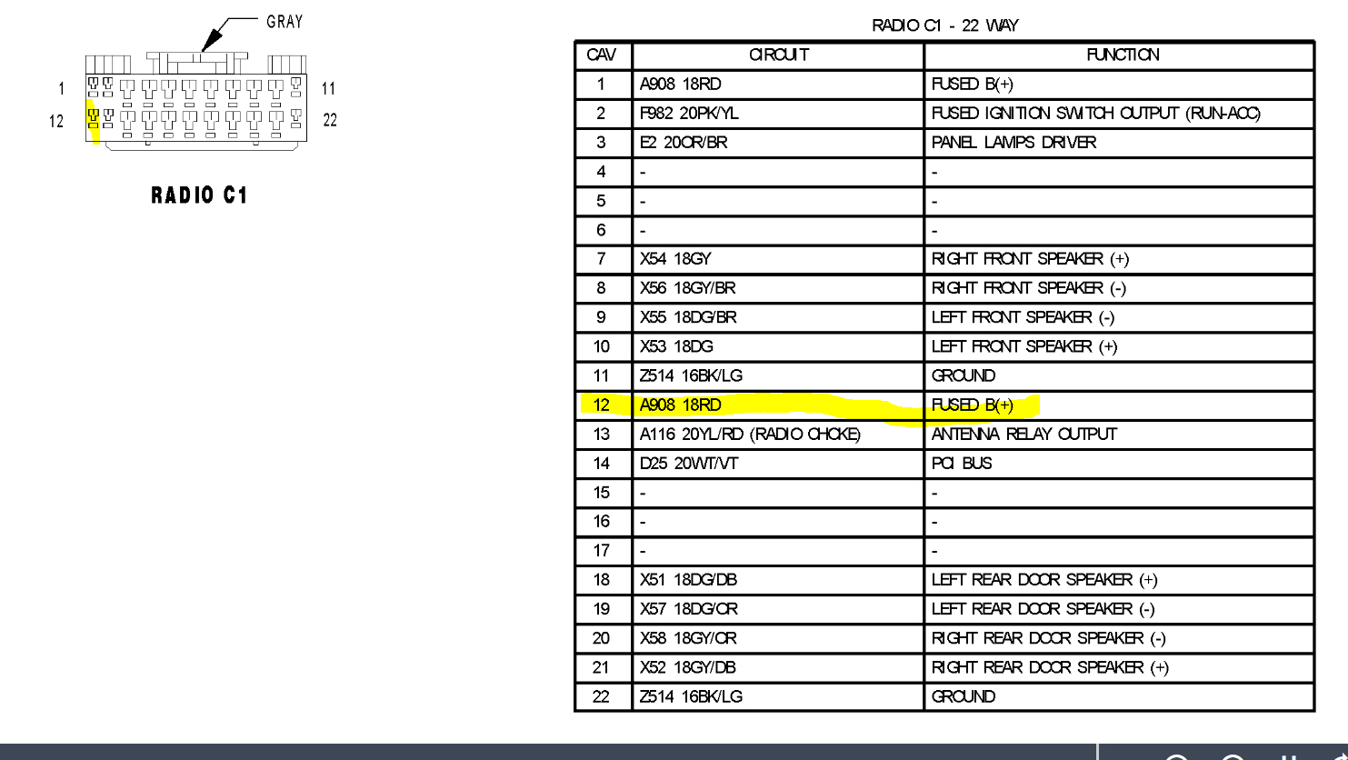 Now, the power to the radio comes from the fused 1 ignition supply. So, to confirm that isn't the issue, you need to check the connector pin on the radio for power. I attached a pic below. All you need is a test light to check for power. Here is a link that explains how in general one is used: