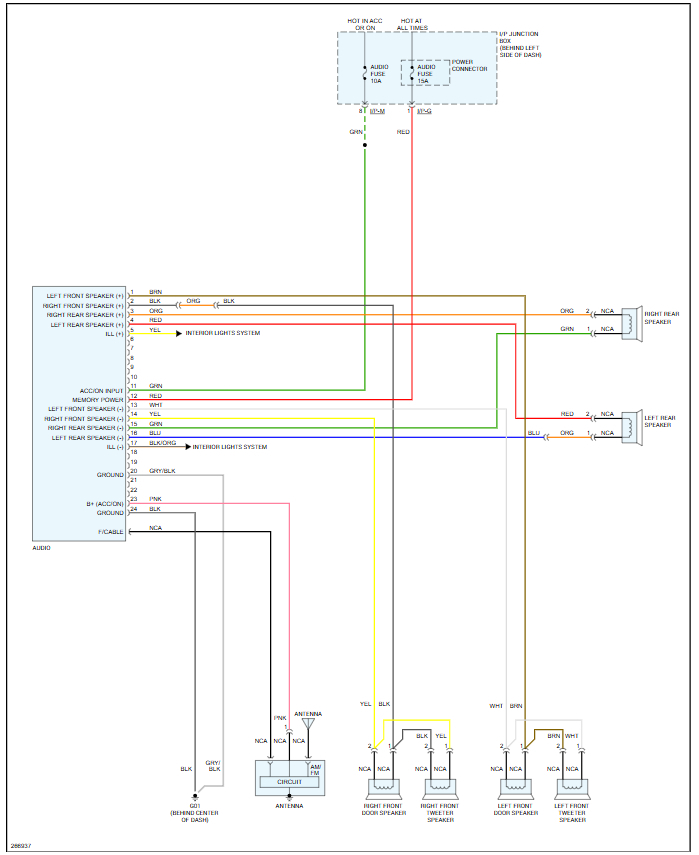Does this car have a factory amp? If so this maybe the reason you cannot hear noise from the radio, does the new radio come on? Here is the wiring diagram for the non amp system. Check out the images (below). Let us know how it goes
