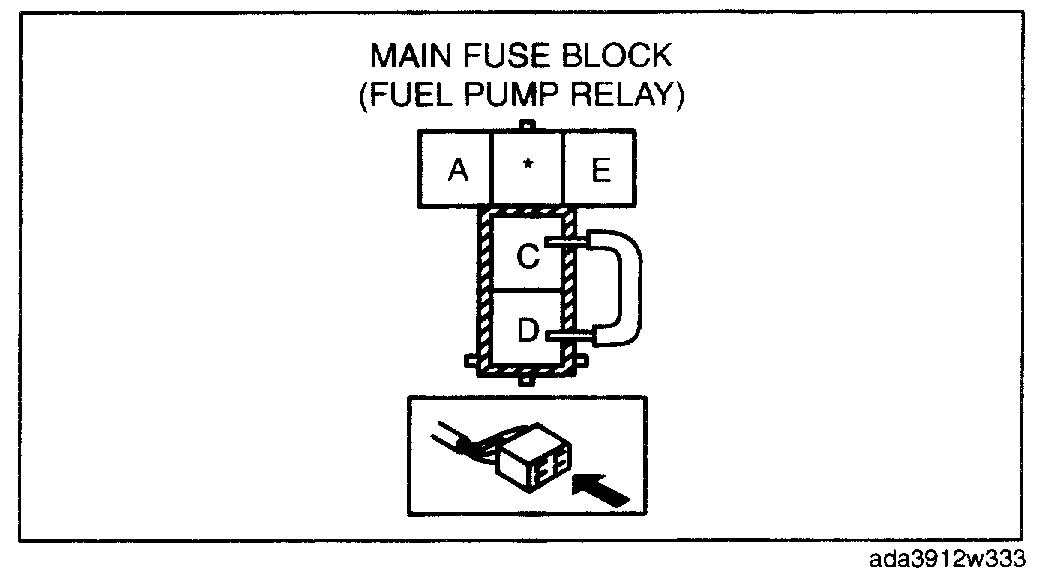 3. Using a jumper wire, short fuel pump relay terminals C and D and connect the negative battery cable to start the fuel pump.