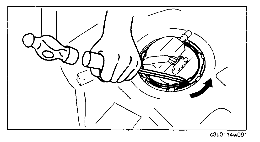 CAUTION: The fuel pump cap could be damaged if the SST is used with any gap between the cap and the SST. Securely attach the SST so that there is no gap between the SST tabs and the side of the cap.