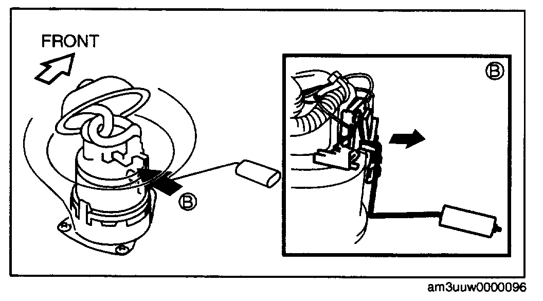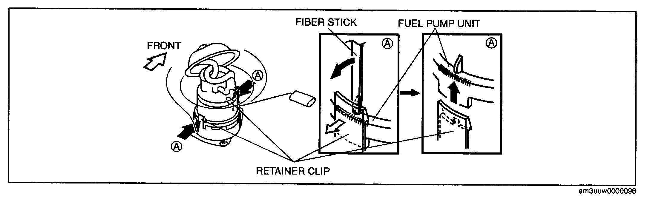 NOTE: The fuel pump unit is secured by the two retainer clips with the bracket on the bottom surface of the fuel tank.