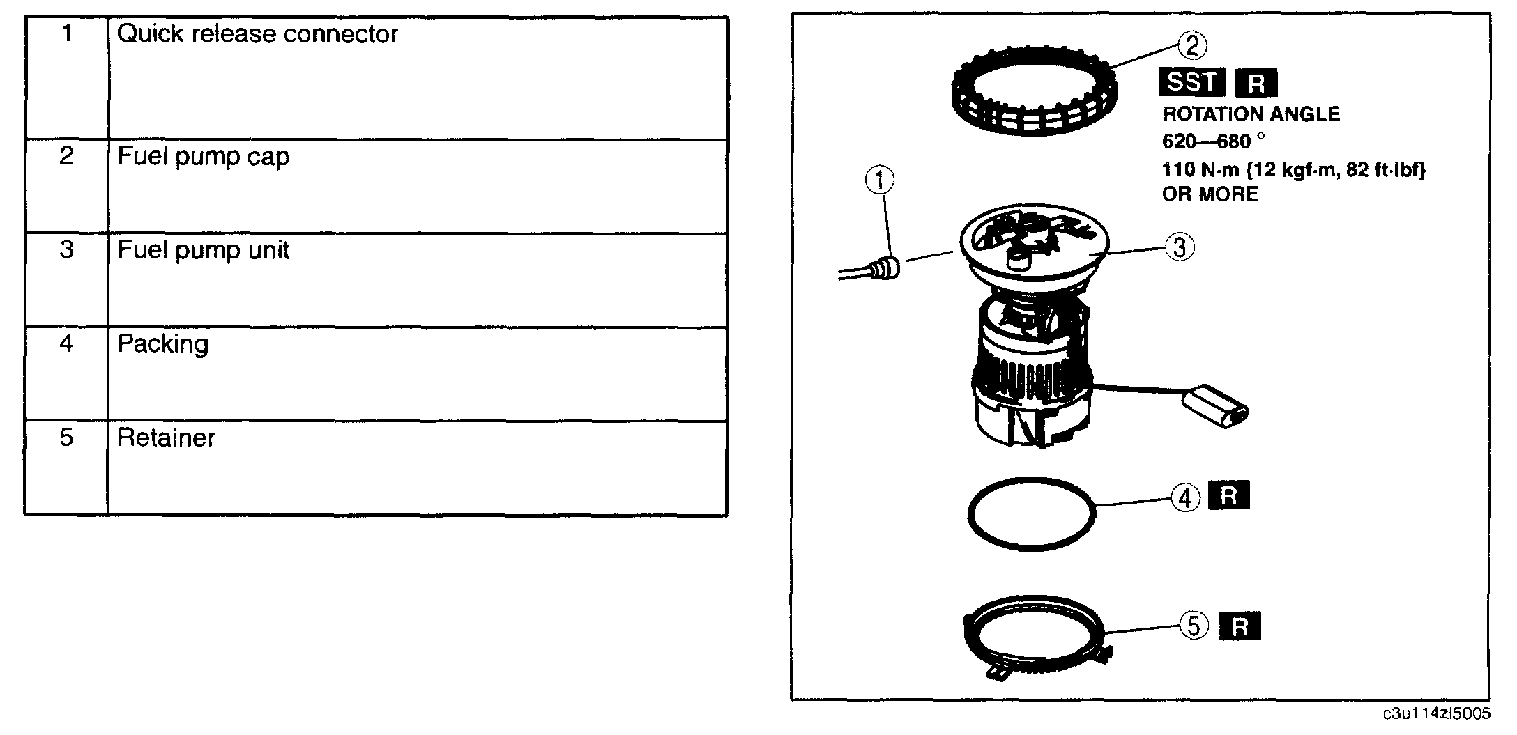 2. Remove the fuel pump cap, fuel pump unit, packing, and retainer.