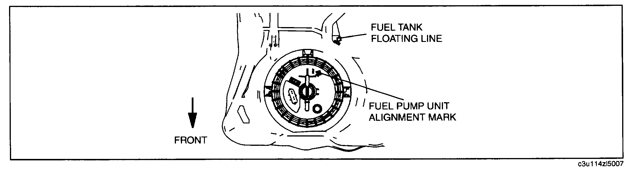 - The fuel pump unit alignment mark and the floating line on the fuel tank