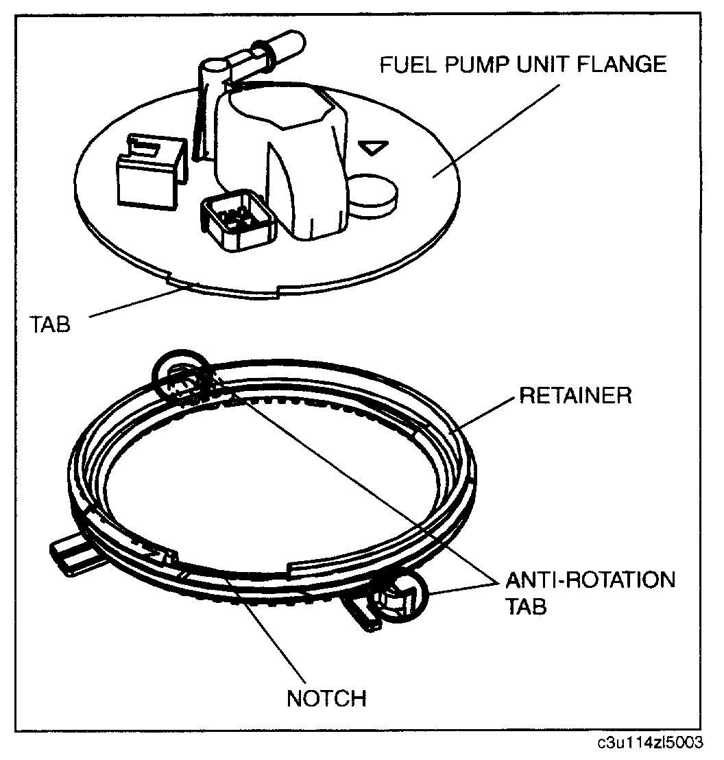 2. Verify the tab on the fuel pump unit flange with the notch on the retainer.
