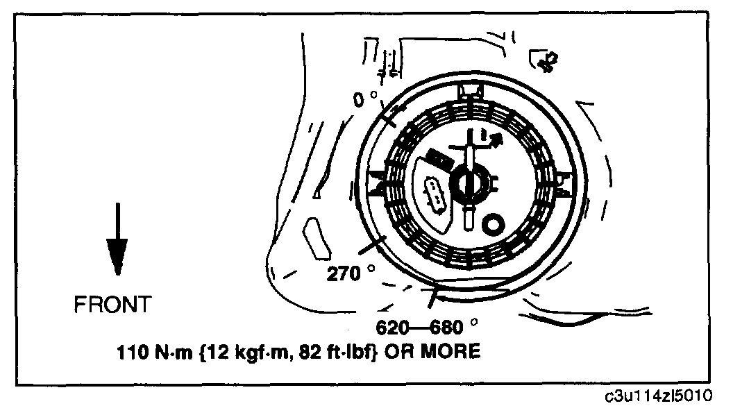 NOTE: The fuel pump unit will rotate and cannot be secured in the specified position if there is any gasoline on the gasket. Thoroughly wipe away all gasoline from the gasket.