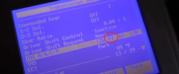 The internal shift info as shown below in the mock scan tool shows that when you select a gear the A/B/C/P switch should change from Hi to Low when you select that gear and it will display the square.
