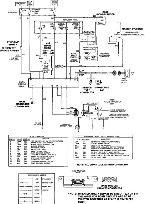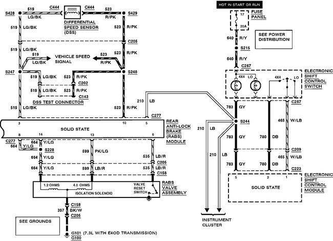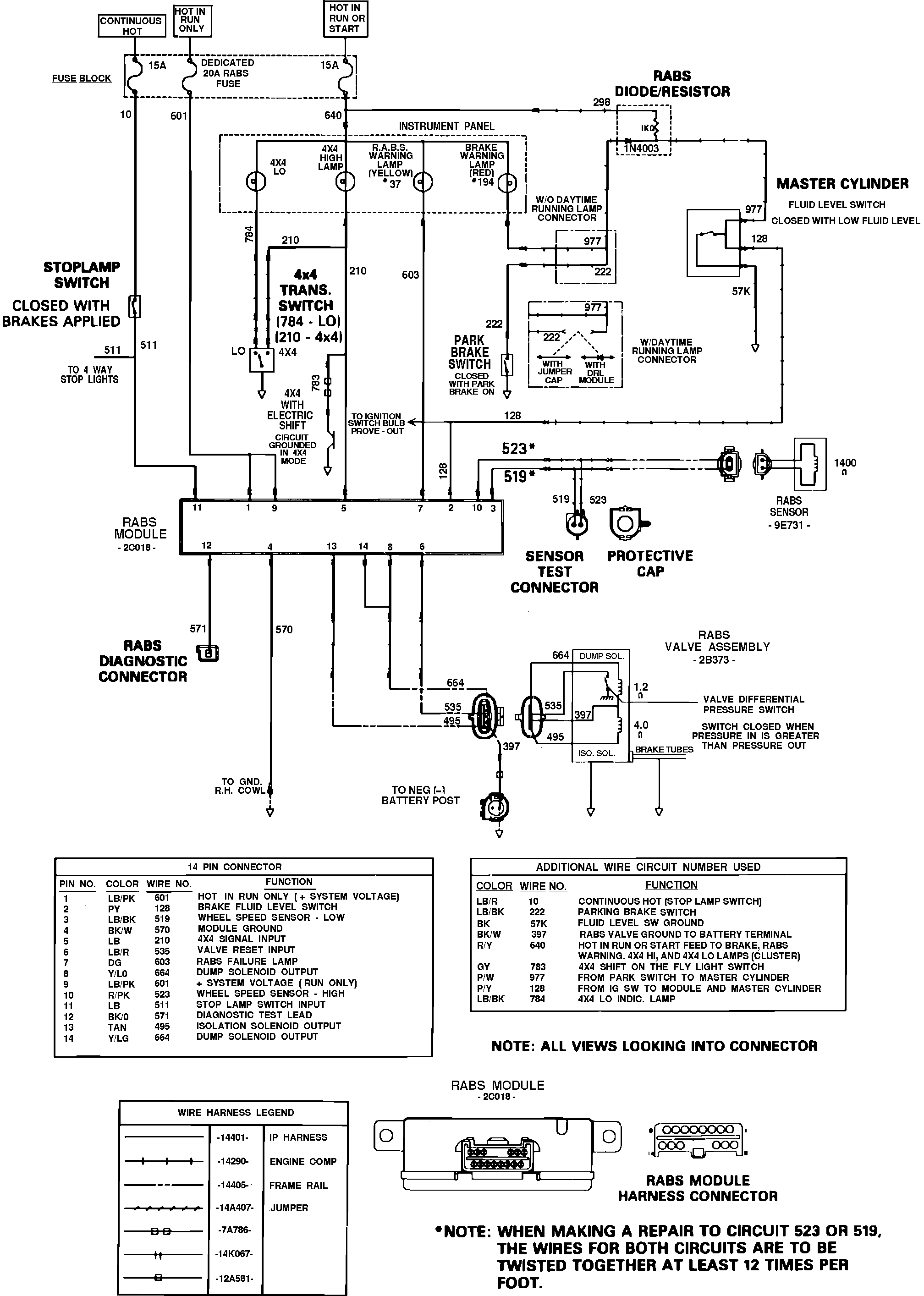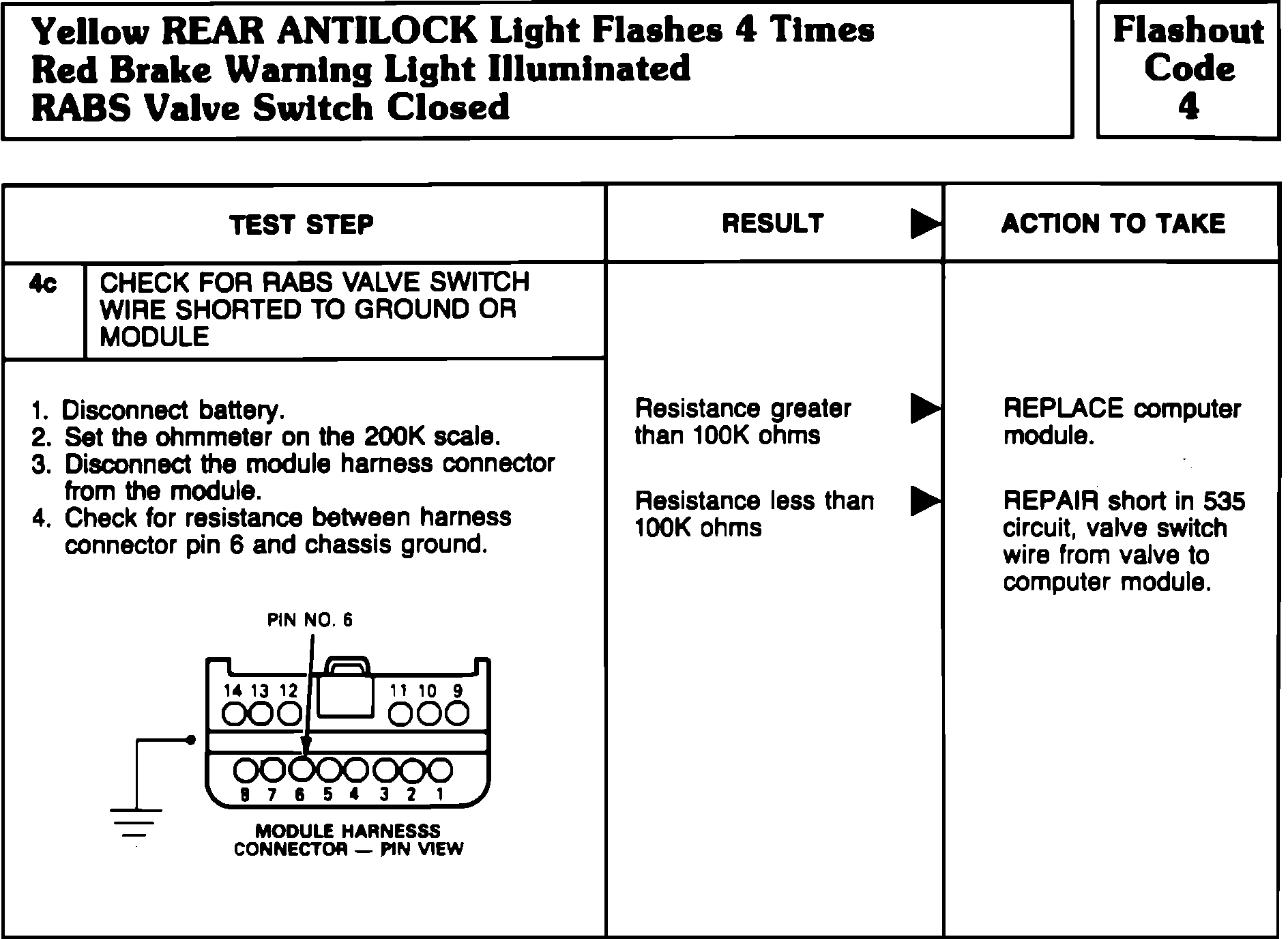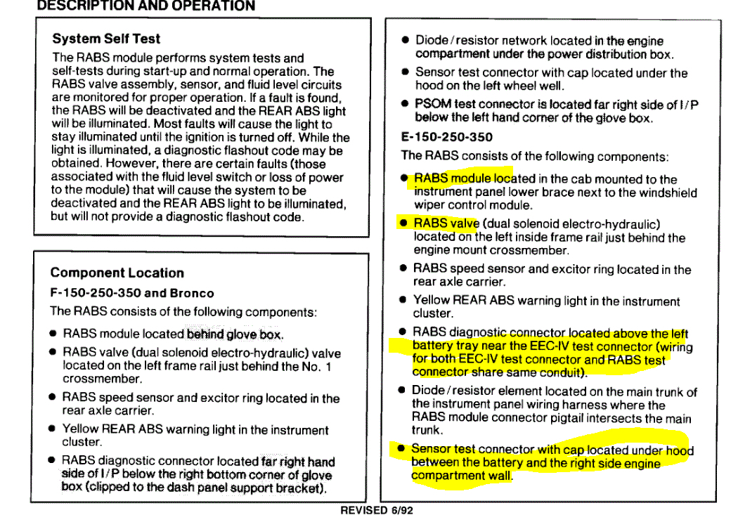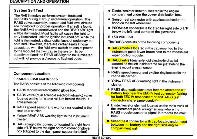 I have determined I have a RABS II system, since the control module is located behind the glove box. I have used the remote access connector which is located on the inside of the left inner fender to test the resistance on the speed sensor. I am reading 1320 ohms, which according to the Hayes manual I have should be above 850 and below 2500.