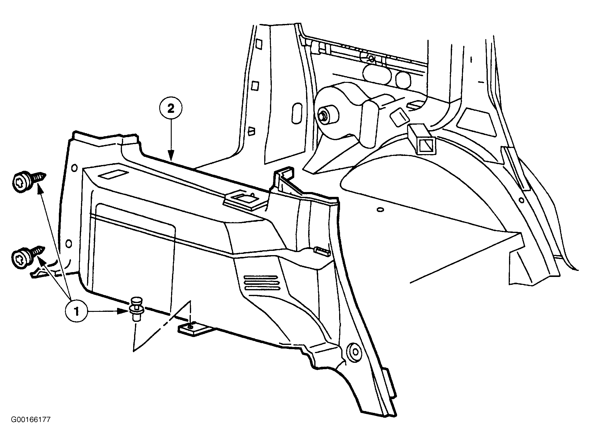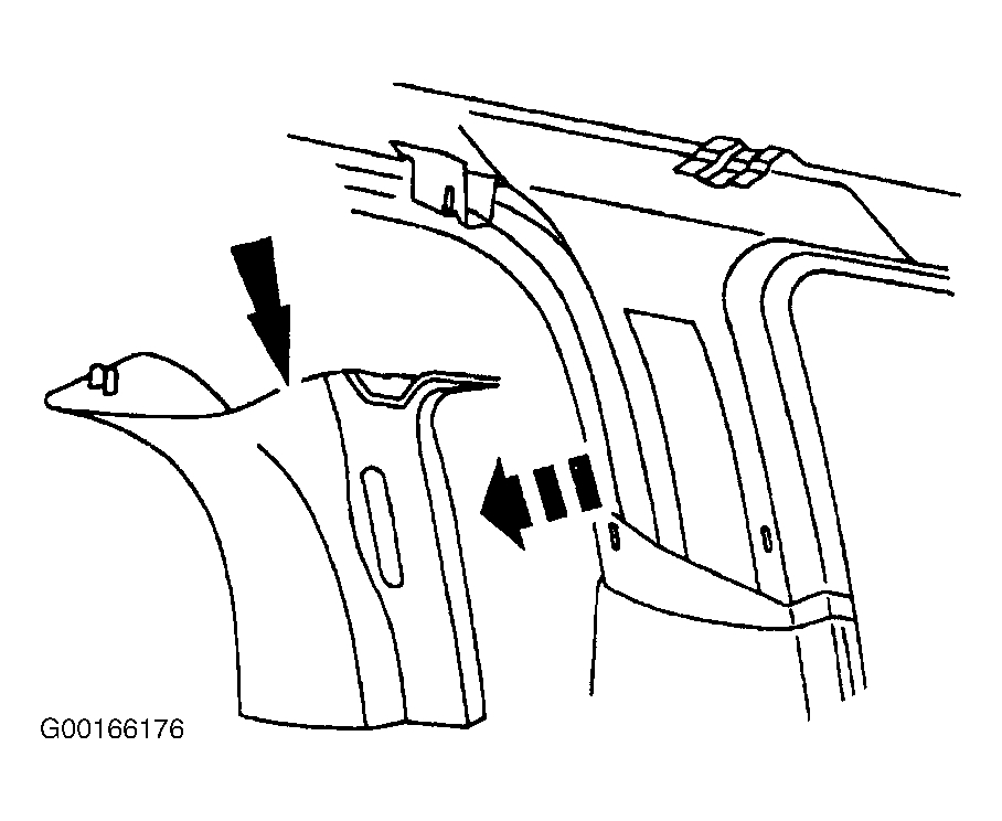 NOTE: Remove the lower hook attached to quarter trim panel, followed by the top attachment, and then the lower rear attachment.