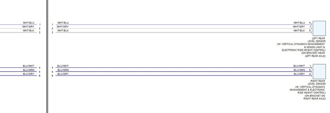 From the description I would check the control fuses but expect to find that it's either a bad height sensor of the control solenoids that are part of the compressor. The rear height system is the last image. If the fuses are good, look for the control module and see if it's taken a bath. Then look at the compressor and it's controls, because if it's running it could still be bad or the control head is not under control of the height system. However there are powers and grounds to test in the schematic.