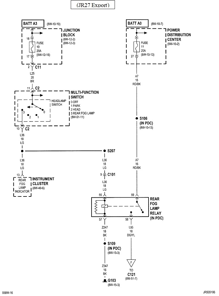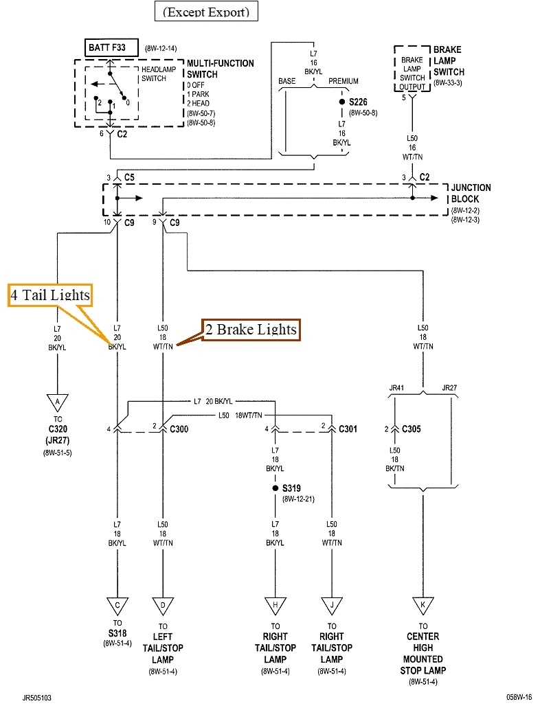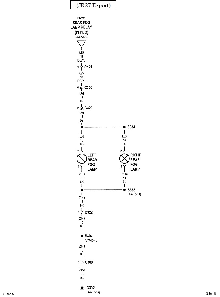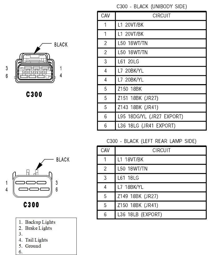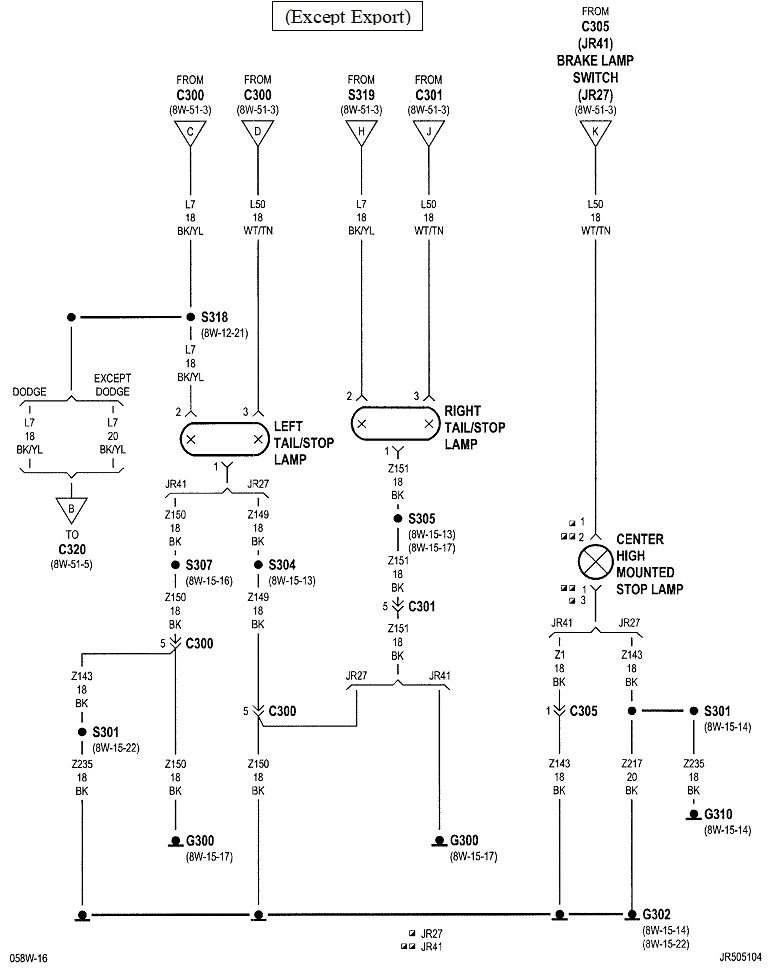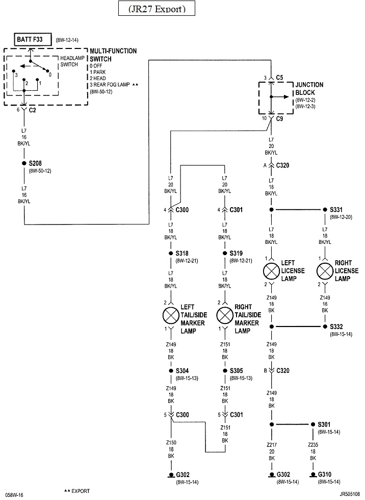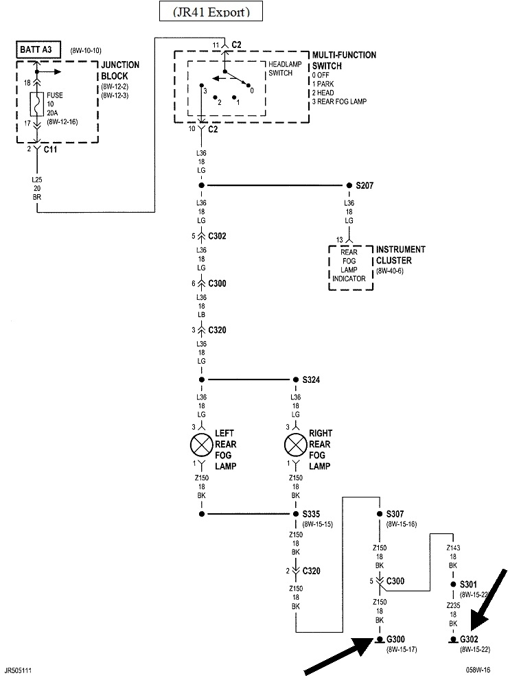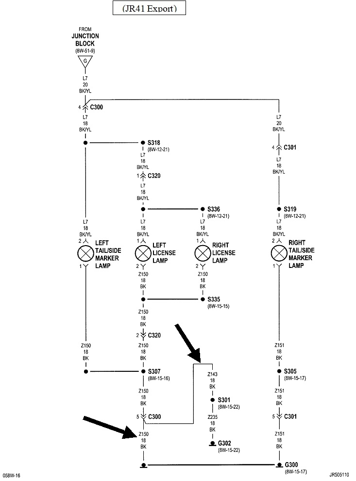 If you find "JR41" in your vehicle ID number, these three diagrams apply and are used with the first four. Notice in the last two diagrams, near the bottom, my black arrows are pointing out there are indeed two black ground wires at terminal # 5 of connector C300. They're grounded at two different places, for redundancy, as indicated by "G300" and "G302". Those are two different grounds, but for the same purpose.