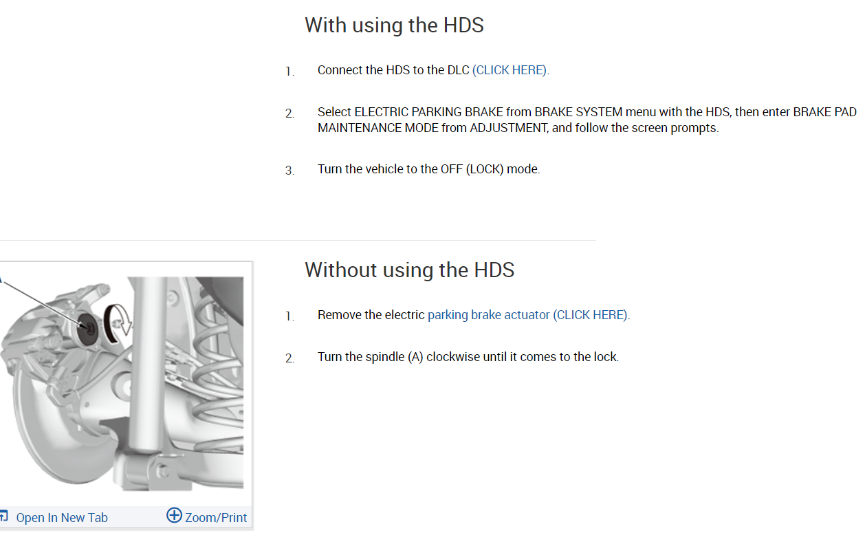 You are going to need to connect the HDS to the DLC to put the car in service mode which will deactivate the parking brake feature. After that you will need to remove the actuator motor to help reset the caliper, here are the instructions on how to replace the rear brake pads and rotors. Check out the images (below). Let us know if you need anything else.