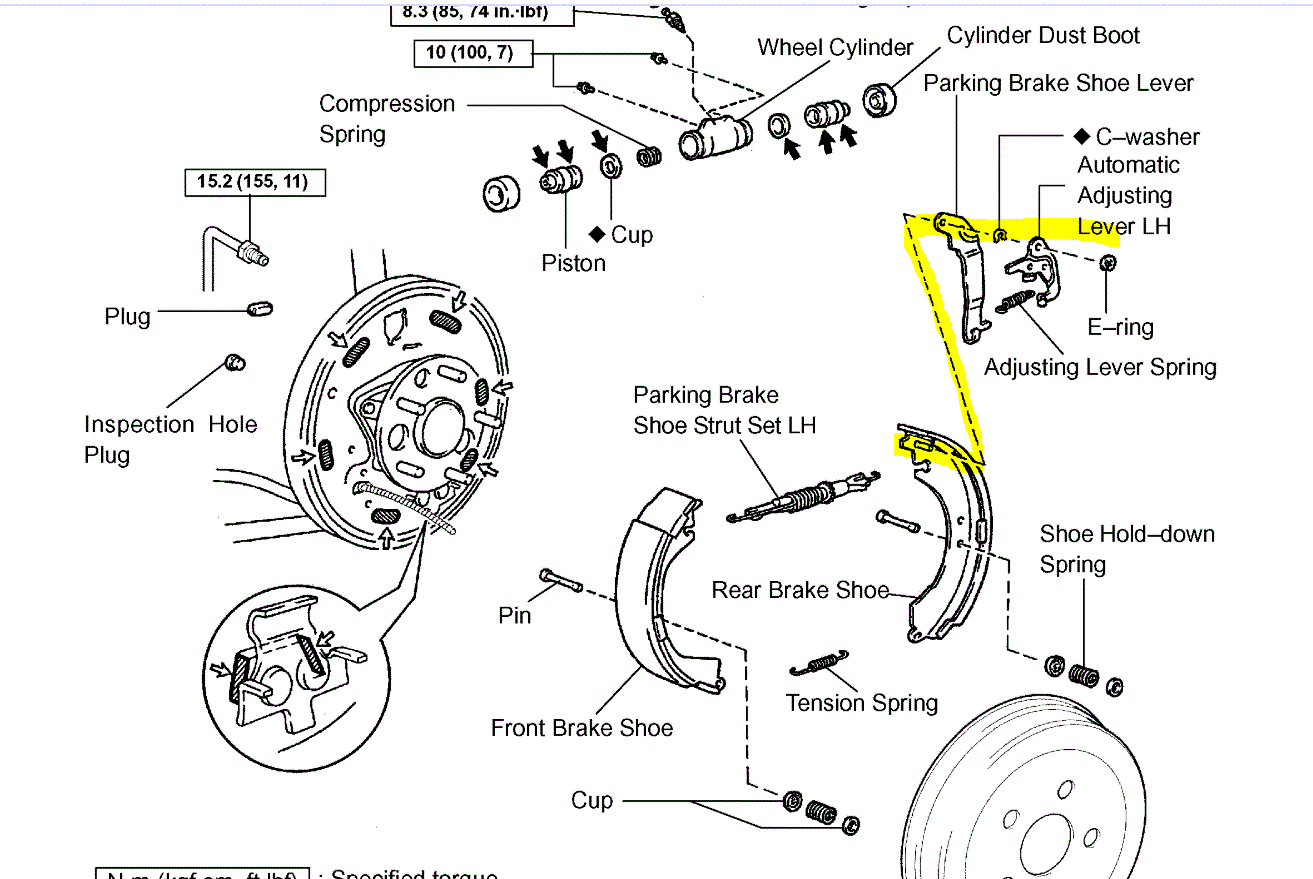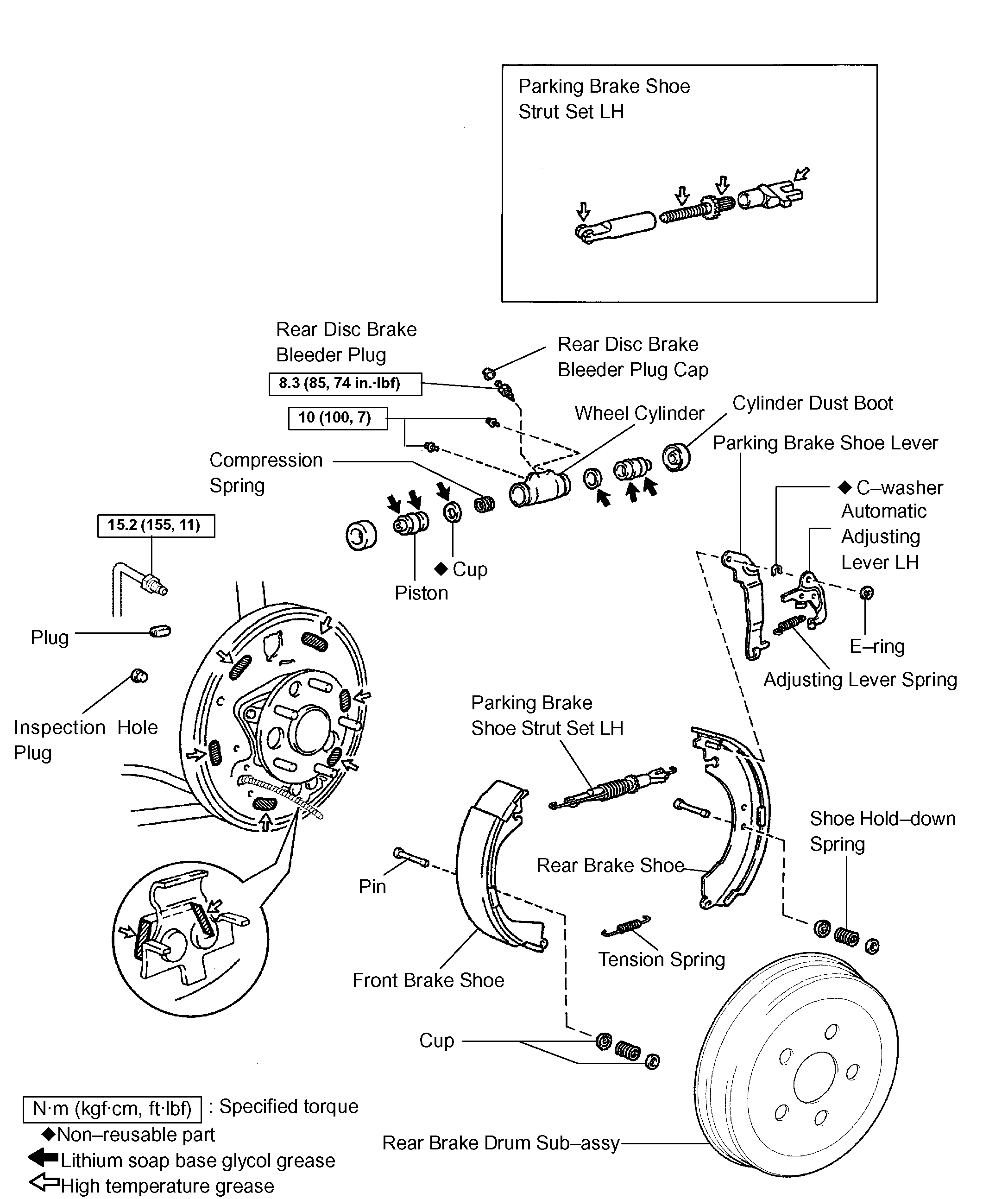 NOTICE: There should be no oil or grease adhering to the friction surfaces of the shoe lining and drum.