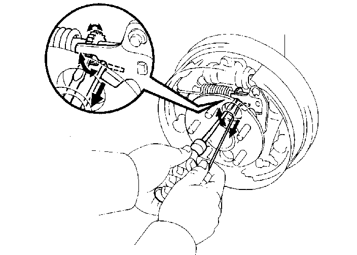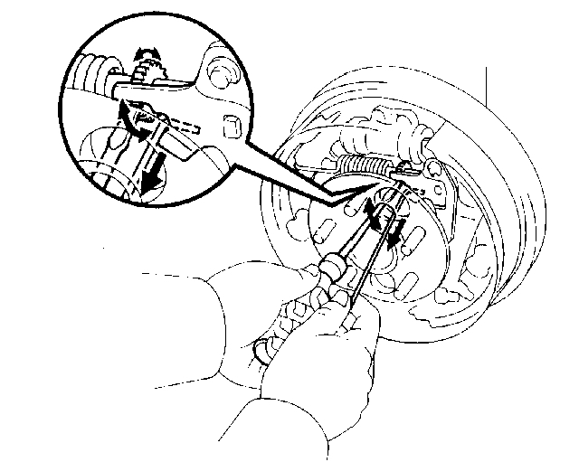 A. Insert a bent wire or equivalent through the hole in the brake drum, and hold the automatic adjusting lever away from the adjuster.