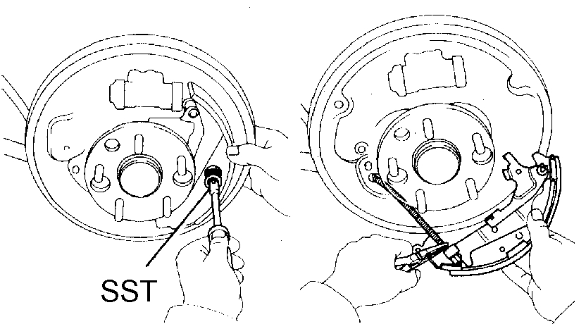a. Using SST, connect the tension spring to the front and rear brake shoe.