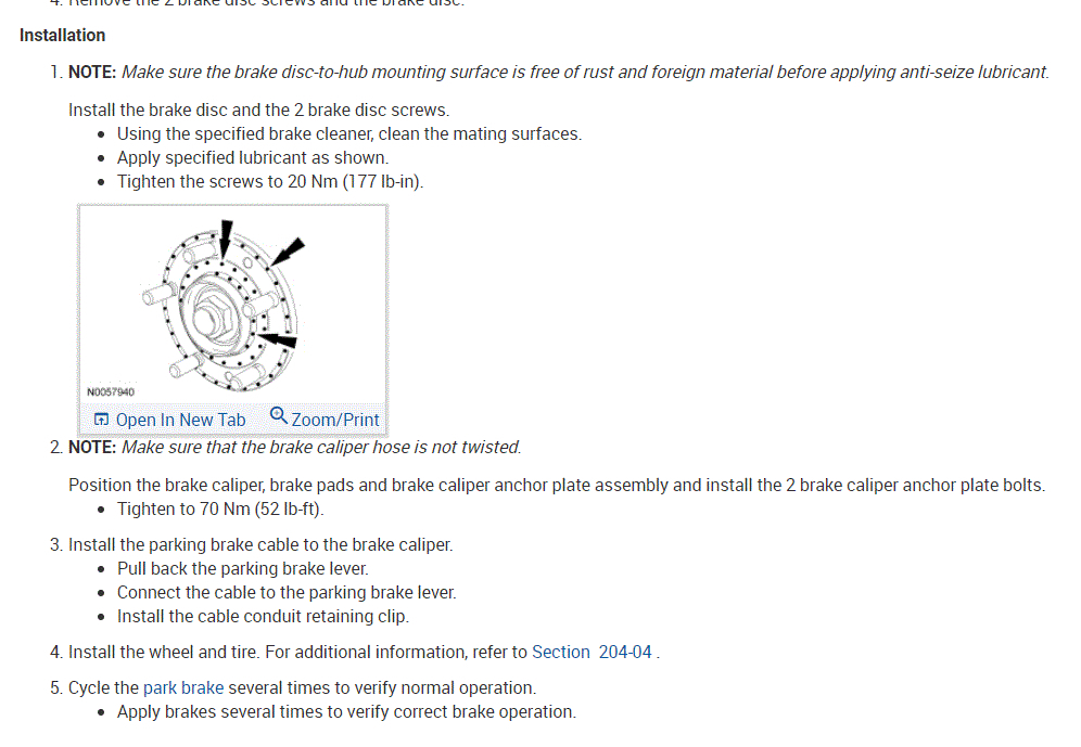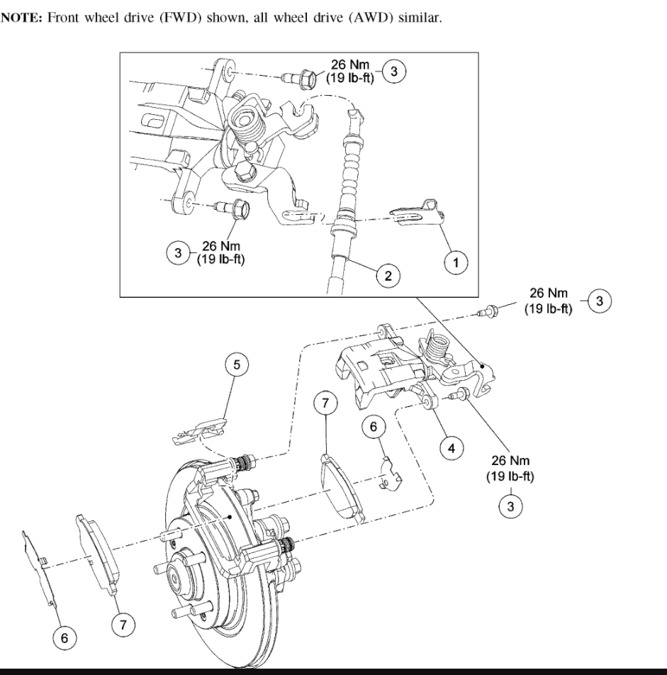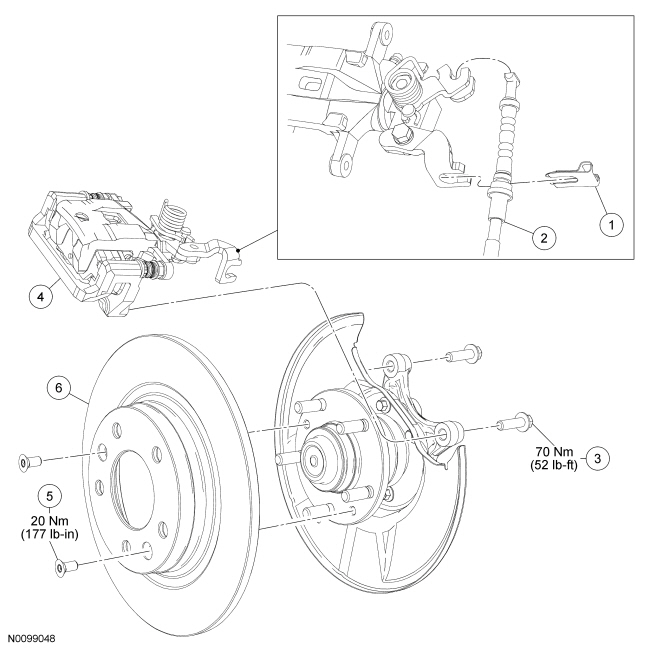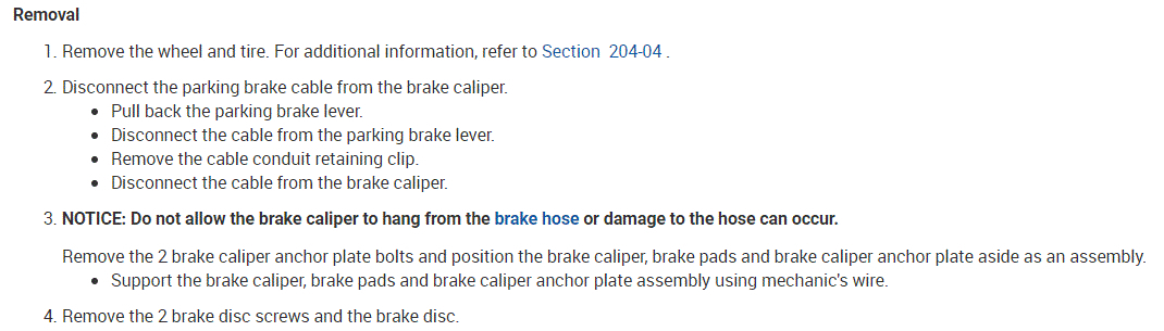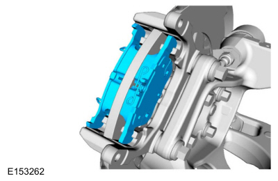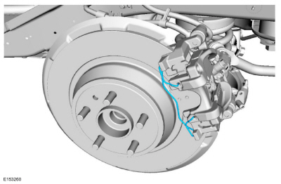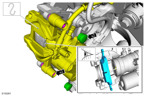 NOTICE: Do not allow the brake caliper and anchor plate assembly to hang from the brake hose or damage to the hose can occur.