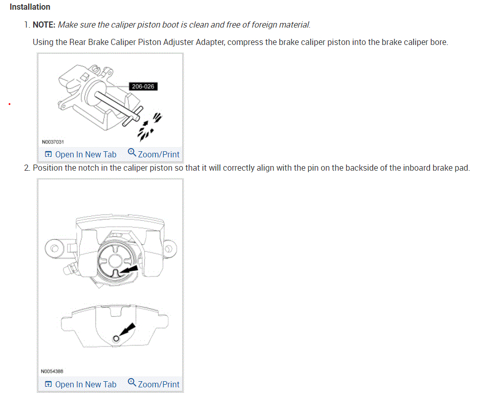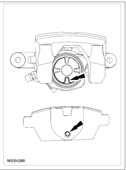 NOTICE: If the inboard brake pad is equipped with a center pin, align the center pin of the brake pad with the brake caliper piston pocket or damage to the brake pad or caliper piston may occur. If necessary, rotate the piston counter clockwise to align with the pin.