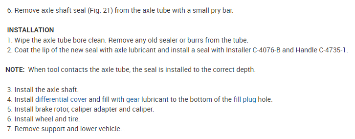 So far there isn't any performance issues or even the slightest noise coming from the rear differential, I been driving it this way and I'll have the pinion seal fixed here shortly, but should I be worried about the axle leak or could it be because of too much fluid? From now on I'm going to check the fluid first with my finger before I put anymore in.