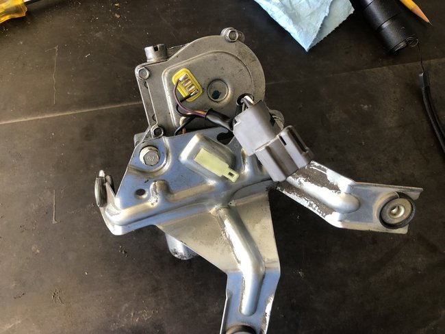 9) My problem was a stripped gear (see pic) and was probably caused by the wiper arm getting snagged due to misalignment of the parking catch on the body and the plastic standoff near the middle of the arm. If the gear is not your problem, find the two wires going to the motor itself and then put 12v to see if it turns (you may have to have the gear out). If it does turn, you can now test the harness side for power when the button on dash is pushed. Good luck!