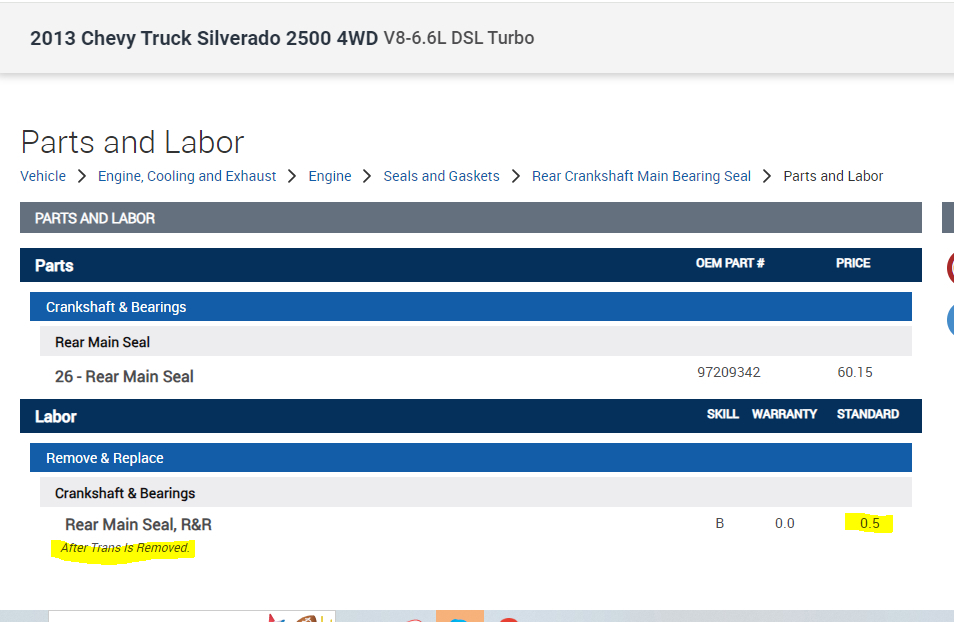 My rear main seal is leaking oil. I am pretty handy, but dropping the transmission is a bit beyond my capabilities (and tools). I know prices can vary widely by state/city, but I'm hoping you can give me a general range of how much I should expect to pay to have a mechanic replace the rear main seal. Knowing how many hours the book says would be really helpful as well!