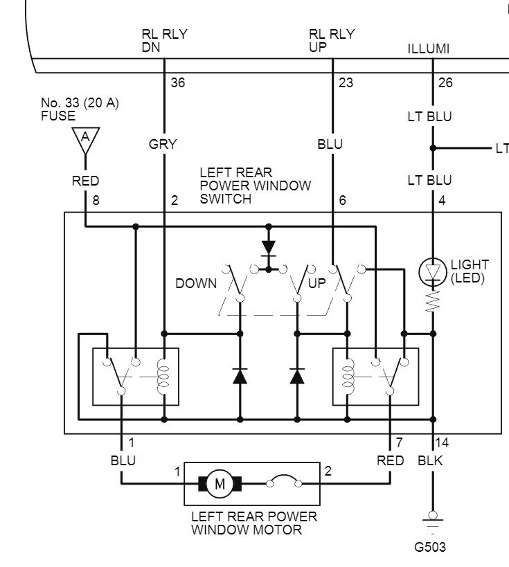 The dedicated switch at the door does not power the window. The master switch for this door also does not power the window. The fuses are good. I figured that because both switches did not power the window, the regulator/motor was bad. I replaced the regulator/motor assembly, and the window went down but still does not go up (still stuck down). Could it be a bad switch? Even if the window will not power from either the master switch and the dedicated switch on the door?