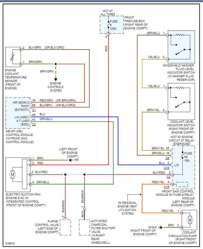 When starting engine cold after a few minutes when coolant temp gauge is about one third the red coolant temperature light comes on and engine shuts down and fuse 54 blows. Then it has no crank and no start. Replace fuse 54 and blows again when turning key to on position. I replaced coolant temperature sensor and thermostat housing and still the same. Disconnected the battery for an hour then connect and it will start and shut down again with temperature light on. No codes on scanner.