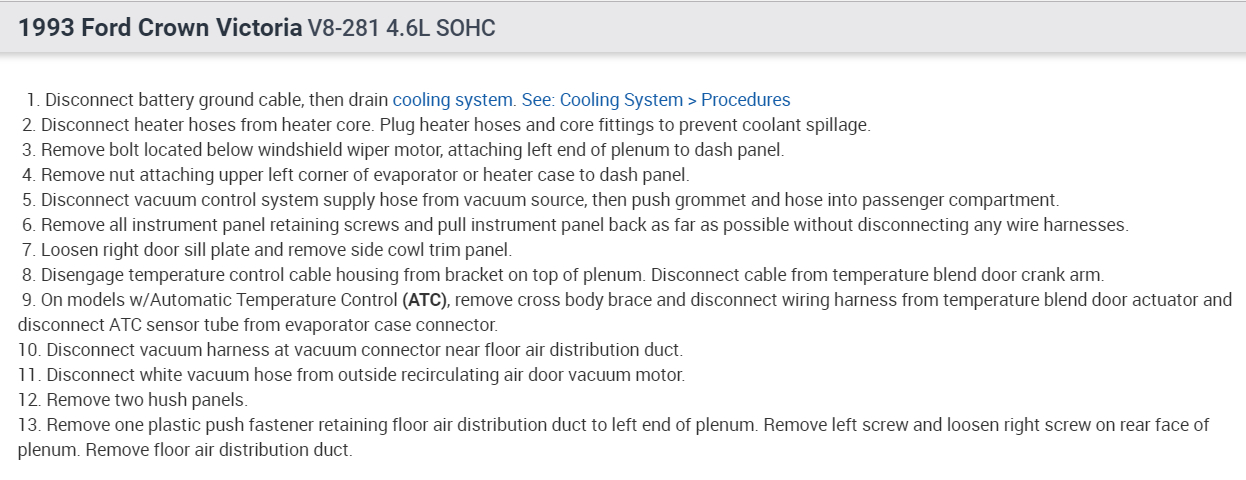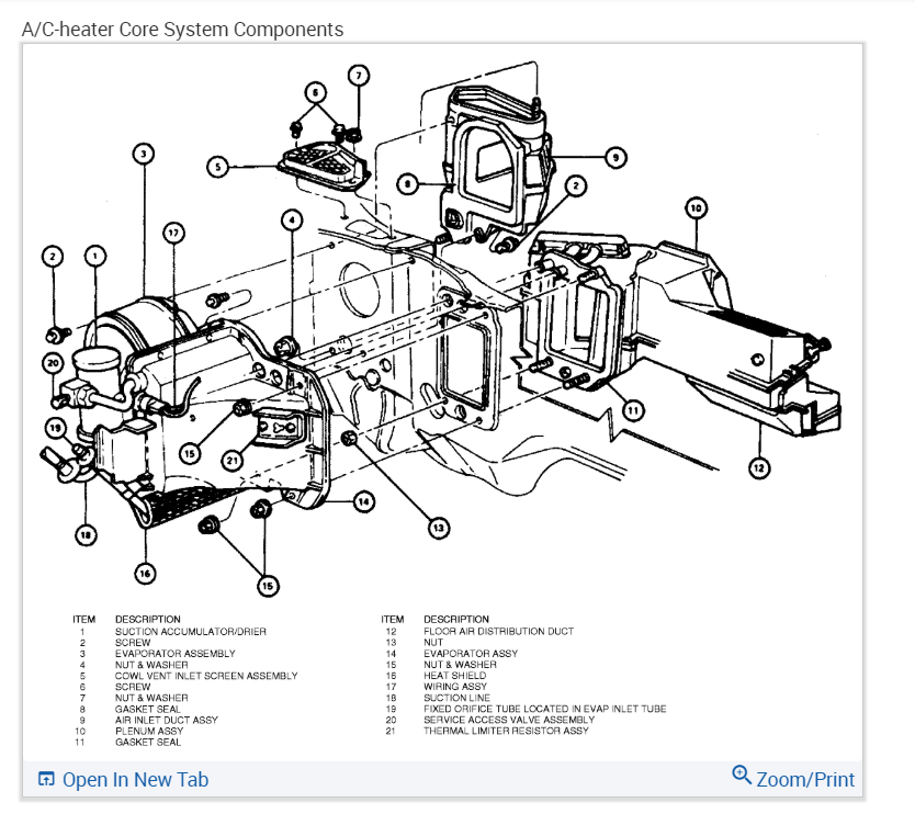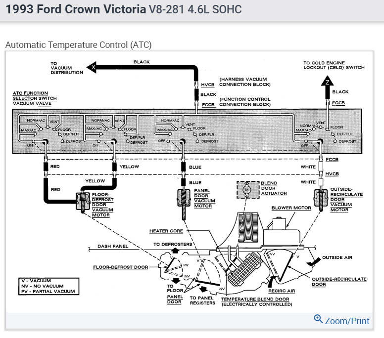 I double checked everything under the hood. I did not see anything obviously broken or cracked. Here is what I found under the hood as best I can tell. There is a main tube that goes from the engine (near the PCV or EGR valve at the back of the engine) that goes into what I believe is a check valve. Off the top of the valve is a small hard black plastic line. Below that is a larger (3/8" - 1/2") rubber line that goes to a black box on the driver's side just ahead of the cruise control. Below that line is a round disk shaped part of the valve. Below that is a port with a rubber cap on it. This is directly across from the tube coming from the back of the engine. The next line below the capped one is a larger rubber line (3/4"?0 that runs to the brake booster. Below that line at the bottom of the valve is a yellow line that meets up with the thin black line from the top of the valve. These two lines make their way into the driver's compartment near the accelerator pedal. The lines then split, the yellow line goes up into the steering column then returns as a white line to the actuator for the parking brake. The small black plastic line continues under the dash/ashtray/cup holder and into a white plastic disk-like device that has all the vacuum lines going to the two actuators (what I call the left and right) as well as the actuator on the passenger side for what I believe is for the defrost. Then the small black line goes with all the vacuum lines on the other side of the white disk into the control panel. I bought another of these a while back but haven't yet replaced it. It is a Motorcraft YH-380 (E1AZ-19B888-B) A/C Valve. That is what I can tell you regarding vacuum lines. All seem in good shape and securely connected. Okay, now this is what happens with actuators left and right when the car is running and I switch the lever from off through defrost. Note the lines going into left are red and yellow and the line going into right is blue. First in the off mode, left is fully in and right is fully out. Next, Max A/C, left is in and right is in. Next, norm A/C left is in and right is in. Next, vent, left is in and right is in. Next, floor, left is in and right is out. Next, defrost/floor, left is out one notch and right is out. Lastly defrost, left is out two notches and right is out.