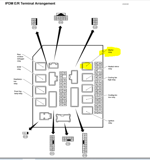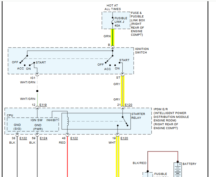 The starter relay is located in the intelligent power distribution box under the hood. Is that where the clicking is coming from? Also, there is a fusible link at the battery (fusible link box) mounted to the positive battery terminal. Fusible link J needs to be checked. If it is good, we need to check the relay itself.