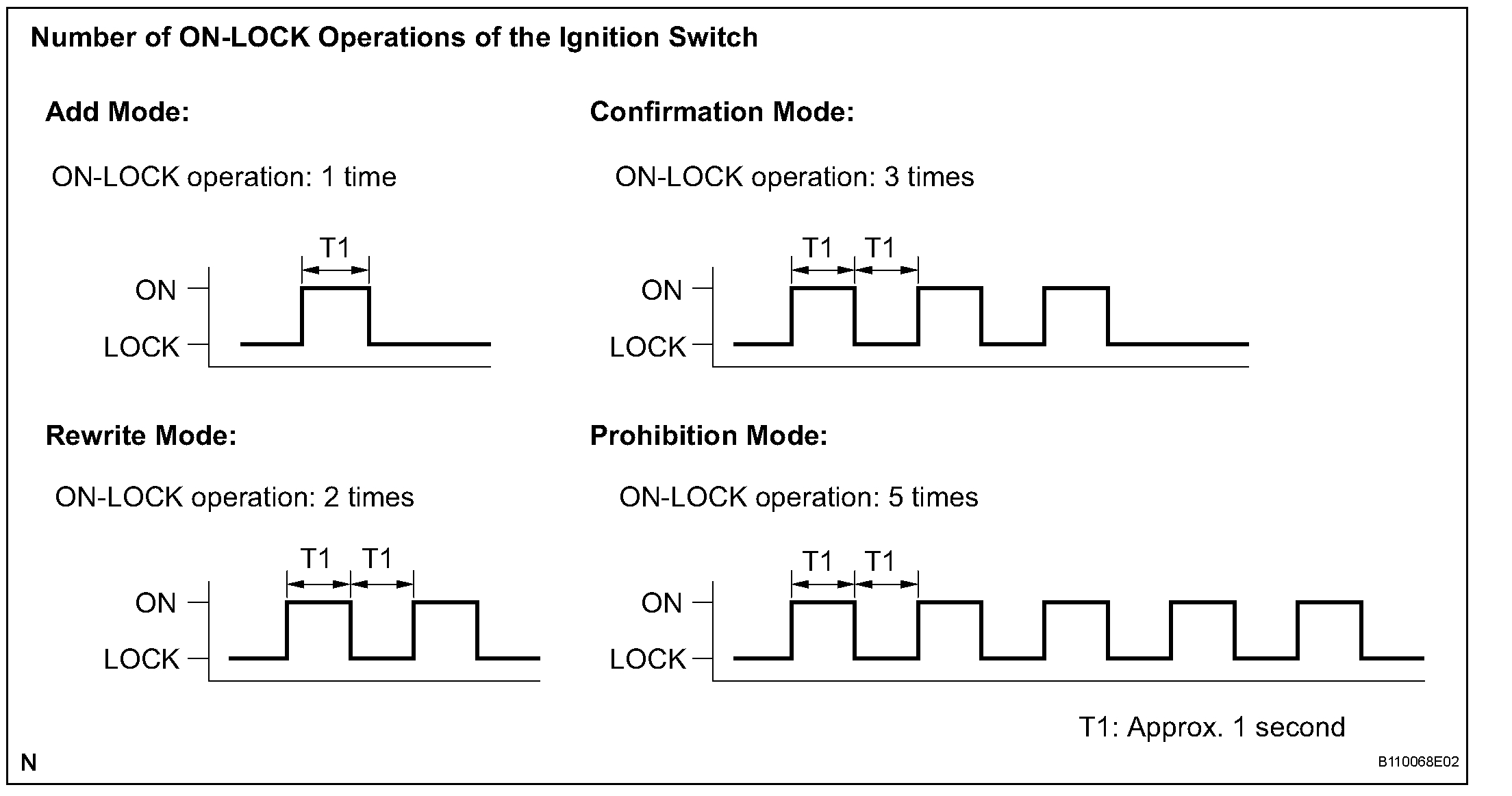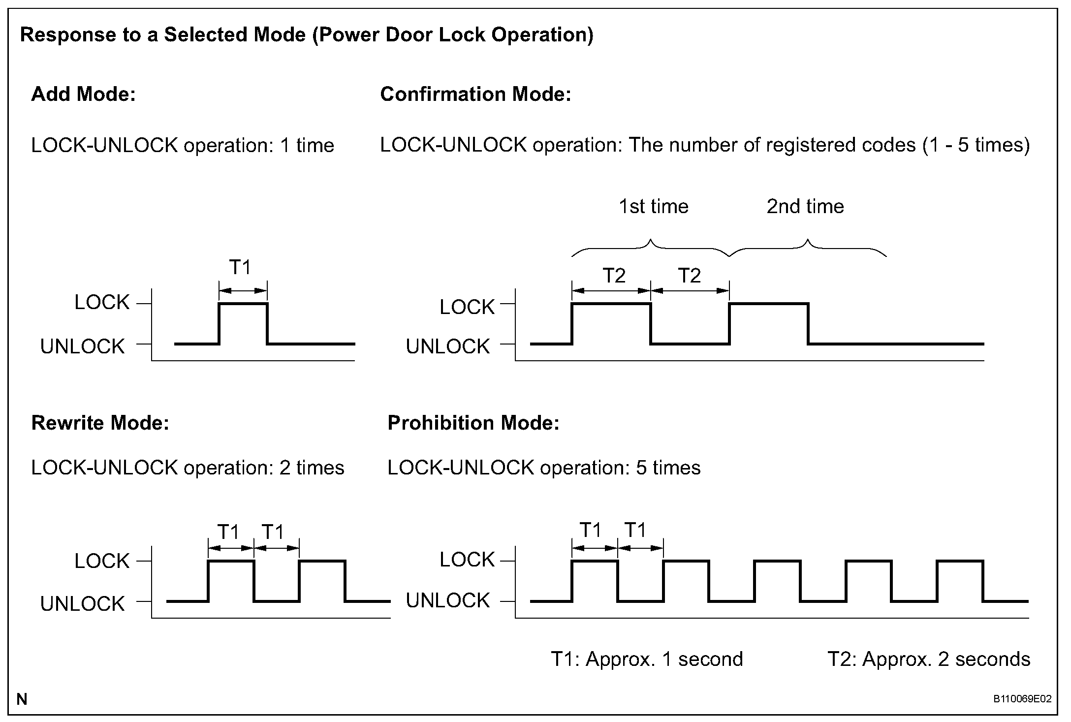 HINT: If the number of ON-LOCK operations of the ignition switch is 0, 4 or 6 or more, there will no response (power door lock and unlock operation) to show which mode has been selected.
