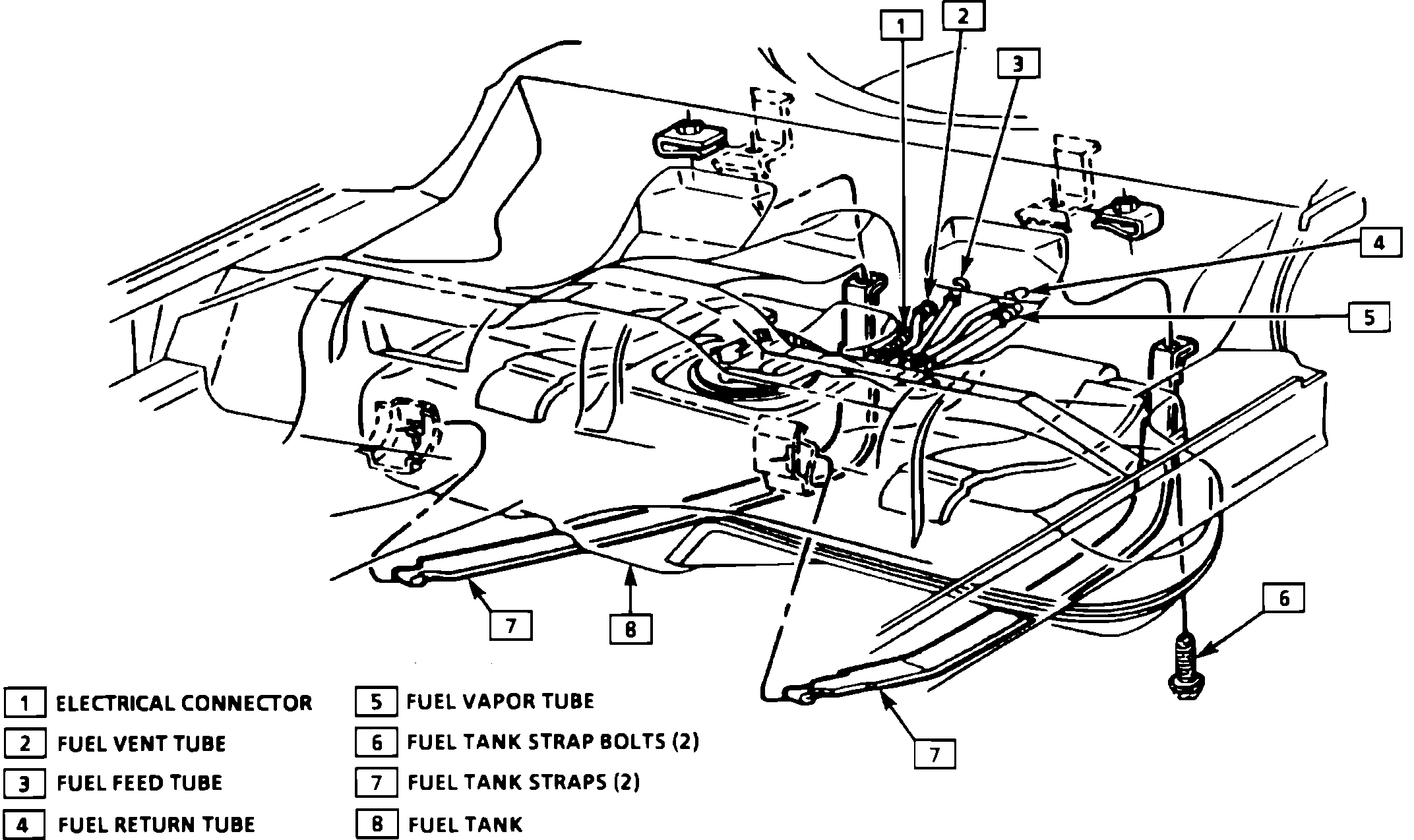 11. With aid of an assistant, support tank, and remove front fuel tank strap attaching bolts and 2 retaining fuel tank straps.