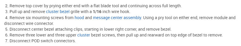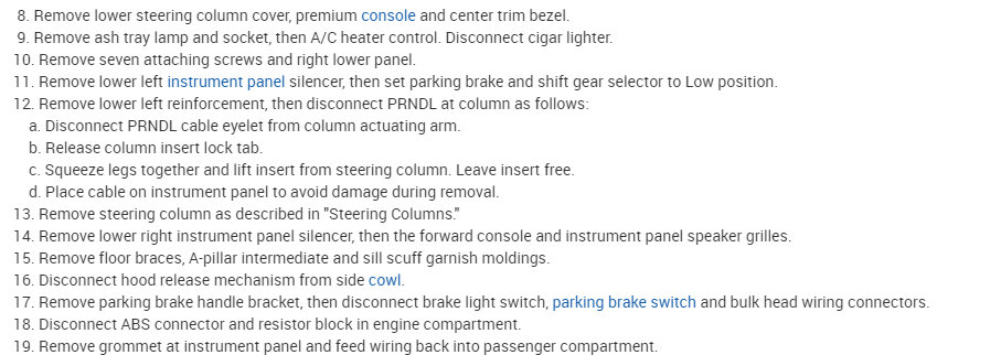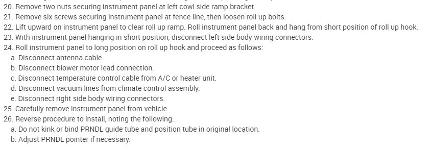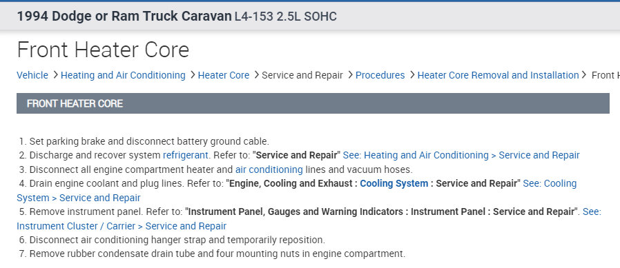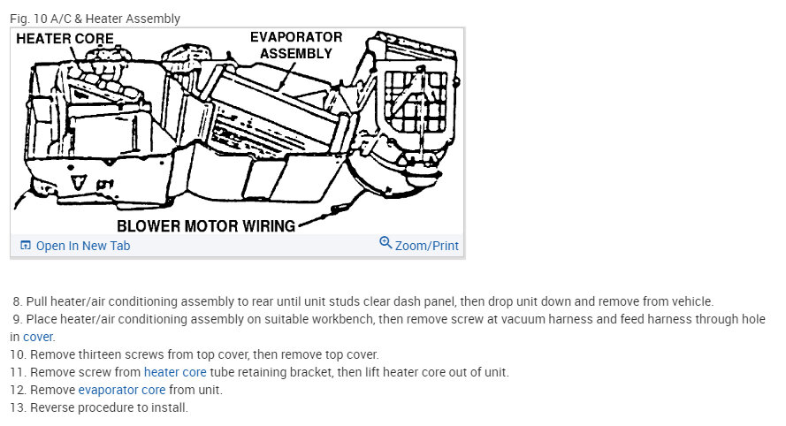 This isn't a horrible job, but it will take a bit of time. If you look below, I started with the directions for the removal and replacement of the instrument panel. After that are the directions for replacing the heater core.