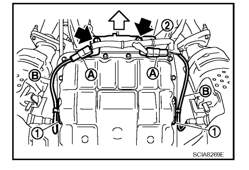 9. Remove heated oxygen sensor 2 harness (B) from clips (1).