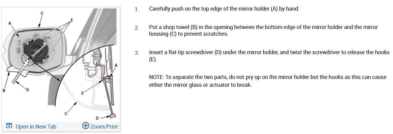 Replacing the mirror glass with an authentic OEM Honda part. I've snapped it in and connected the two de-fog wires, but the mirror does not move when I "reposition" it to align with my side view. The motors/actuators run when I move the controls from the driver's seat, but the mirror does not. I feel as though the actuators aren't connecting to the back of the mirror glass. I just can't seem to attach the glass to the the moving parts of the motor, and I'm not sure how to correct that. Any advice?