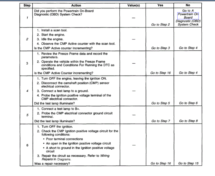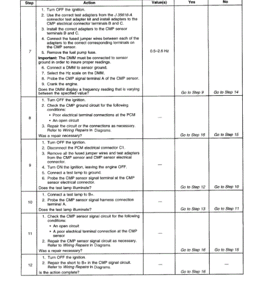 7. This step checks the output of the CMP sensor. If there is a varying voltage, then the problem is in the CMP signal circuit. If there is no varying voltage, then problem is in the CMP sensor electrical connections or is a malfunctioning CMP sensor.