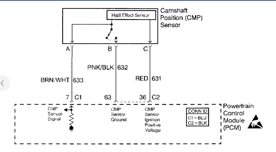 The Camshaft Position (CMP) sensor correlates the crankshaft to camshaft position so that the Powertrain Control Module (PCM) can determine which cylinder is ready to be fueled by the injector. The CMP sensor also determines which cylinder is misfiring when a misfire is present. If the PCM receives an intermittent signal from the CMP, then the CMP Resync Counter will increment. When the PCM cannot use the information from the CMP sensor, a DTC is set and the PCM will fuel the engine by using the Alternating Synchronous Double Fire (ASDF) method.