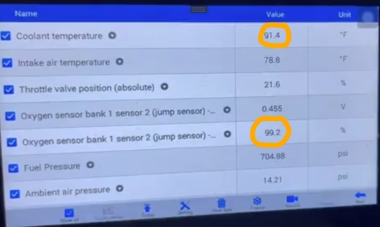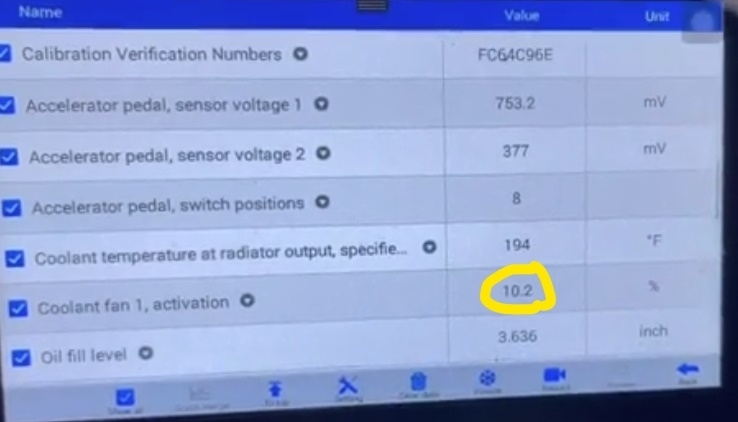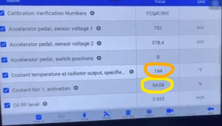 1. The Coolant temperature sensor is only reading (pics 1 and 2, 3) and the cooling fan jumped from 10% to 54.4% and the car is nowhere near operating temperature.