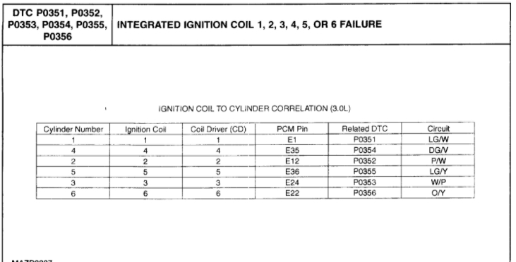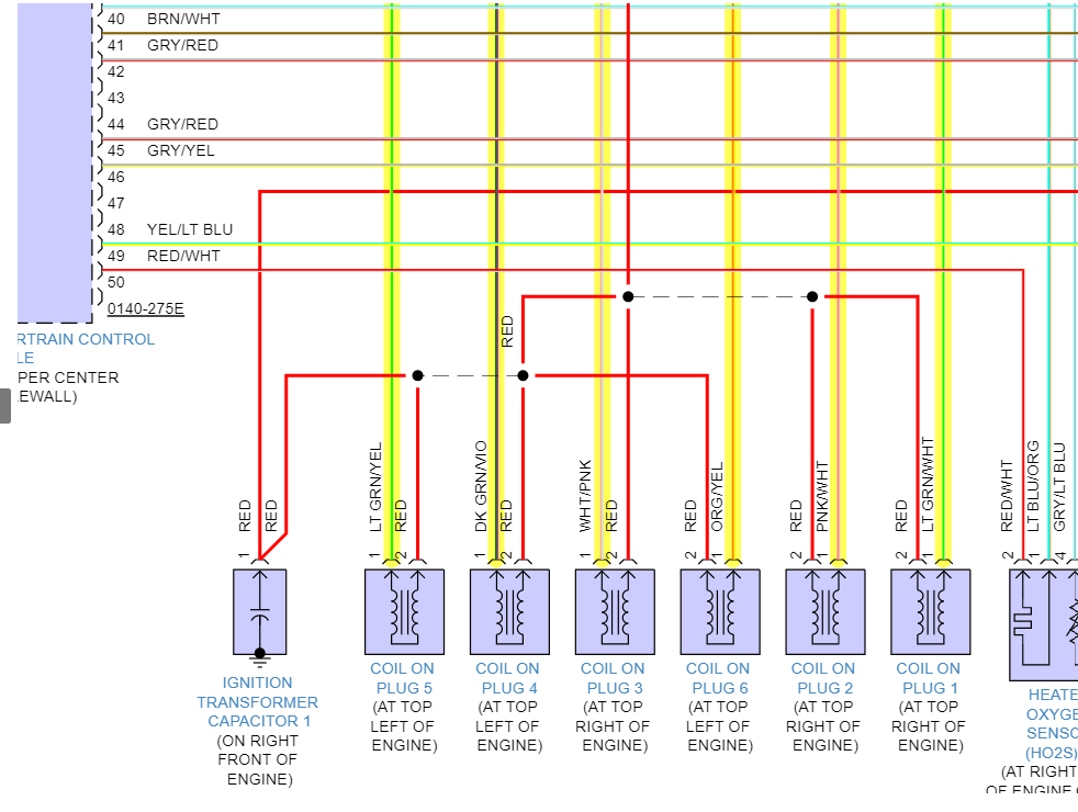 I did find out that the P0351 and P0352 are cylinders 1 and 2. Also included a wiring diagram for the ignition coils. The red wire is the battery feed to each coil. so, at Key On engine off, you should have 12volts on each red wire at each coil.