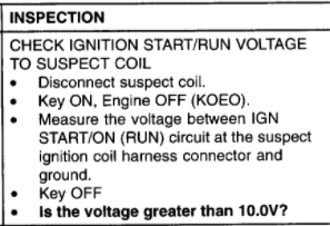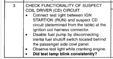 With the fuel system disabled, just touch the test light to the light green/white wire on the coil harness connector and have someone crank the engine over for you. The test light should flash, because remember that the ECM grounds that wire to fire the ignition coil. So, if the 12-volt test light flashes, that means the ECM is controlling the ground wire at that coil. If it doesn't flash, that means that the ECM is has no control over the coils ground side. The driver has been damaged.