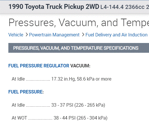 I attached the fuel pressure specifications below for the 22RE engine. If you have the 22R, it will have a mechanical fuel pump and the pressure is much lower, so let me know.