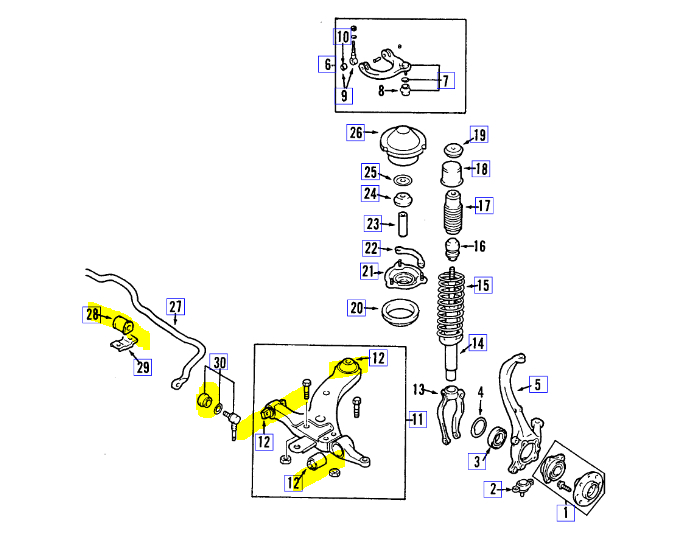 I attached an exploded view of the front suspension components and highlighted bushings to check as well.
