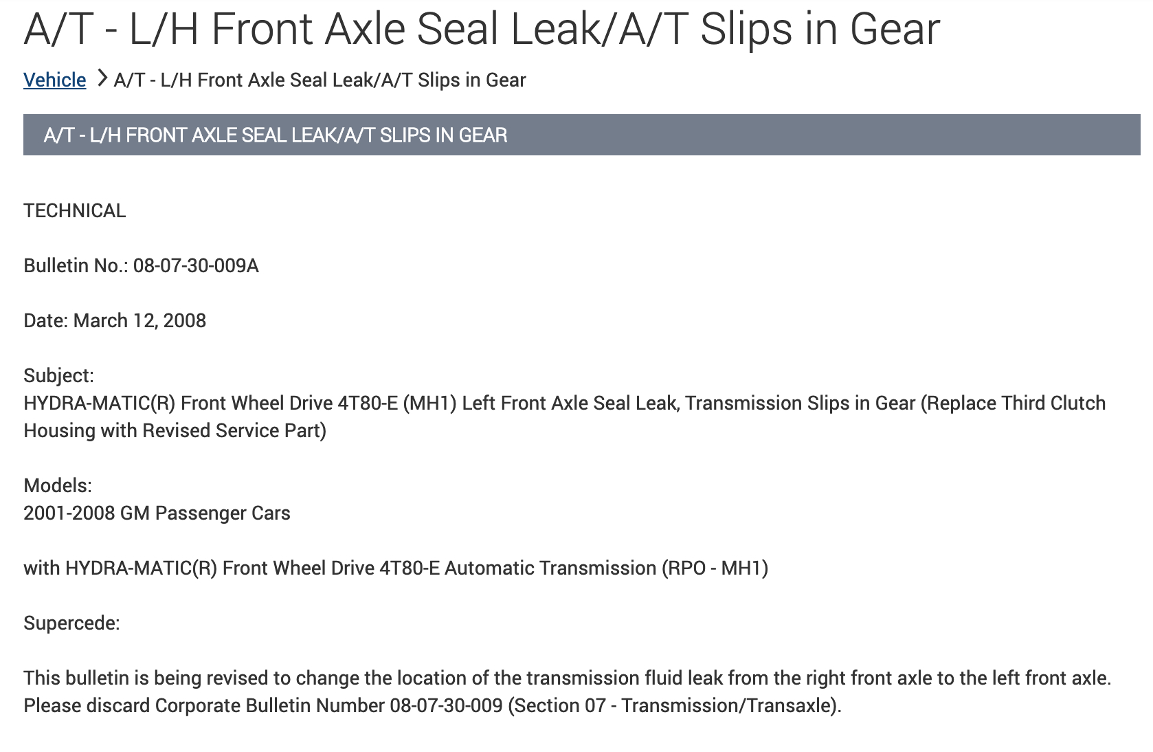 The TSB describes an issue with the output oil seal to the left front driveshaft leaking.