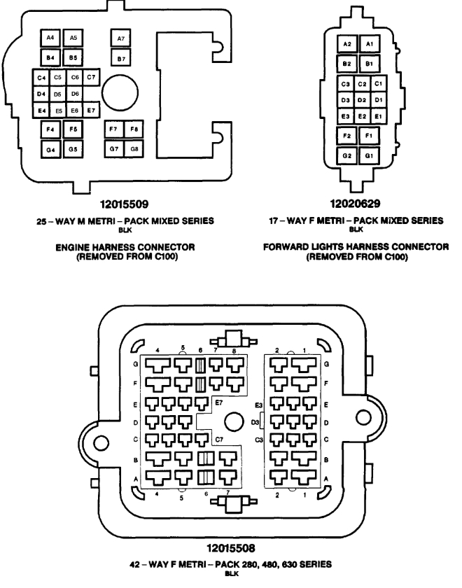 Okay. I seem to be able to find every possible auto wiring diagram for every car/truck ever made but the 1 or 1's that I desperately have been after for over a year now. Please help me out here! I simply want a diagram of the 42way MetriPack f connector assembly. Including the 25way and 17way MetriPack mixed junction fuse block 280/480/630 male blade terminal pinout diagram. I would like it to include Cavity alpha numeric row columns, description of connector(function) cavity male and or female side. (Of course it all dead ends with the circuit fuses on the fuse block panel. ) So really just the pinout of the blade terminals in the 25/17way MetriPack junction block connector, the wire gauge, the wire color, the size of the terminal and placement as is A1, starter, pink wire, 10-12awg and so on until both the 17 way Front headlamp wiring harness and the 25way Engine harness has a complete diagram so I can crimp the terminals and plug them into the proper alpha/numeric row / column. Put my engine bay to cabin junction block connector s together and get Ruby up and running once and for all so I can tell all the skeptics to bite me for telling me to junk her (Ruby) or I will never get her running again. Please! You've sent me diagrams and information before I have been learning how to read electrical diagrams and the function of components and the basics of auto mechanics from the ground up! I need an ez peazy 101 chart for dummies. I've seen these charts/diagrams for everything BUT Ruby. A 1996 Chevy Corsica 2.2L automatic 3 speed 4 door sedan. VIN#1G1D554XTY248314