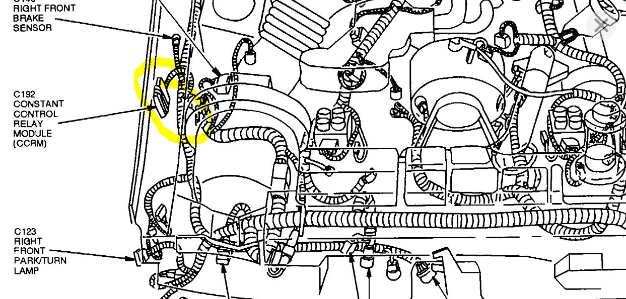 The Constant Control Relay Module (CCRM) interfaces with the Powertrain Control Module (PCM) to provide control of the cooling fan and A/C clutch. The module includes the PCM power relay to provide power to the PCM.