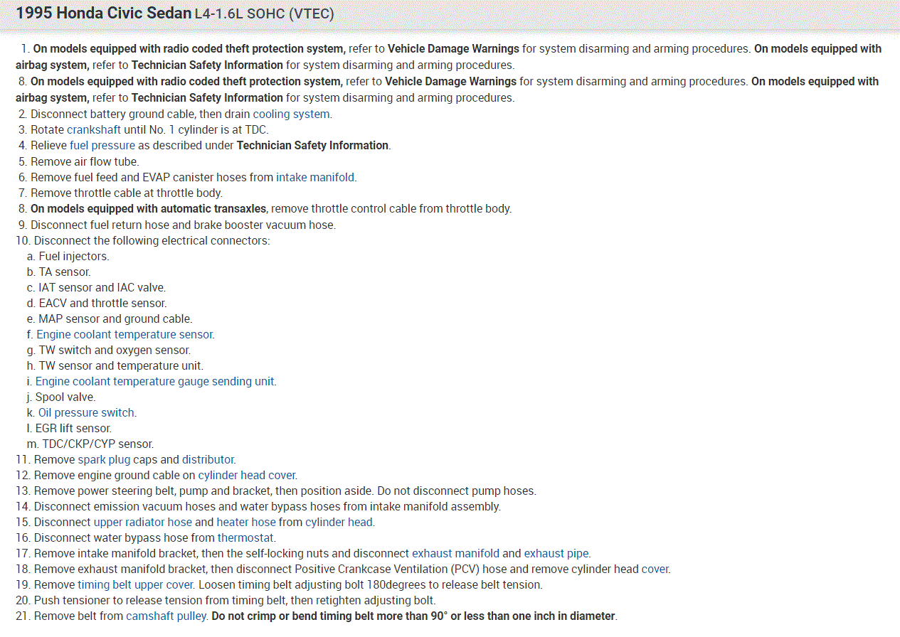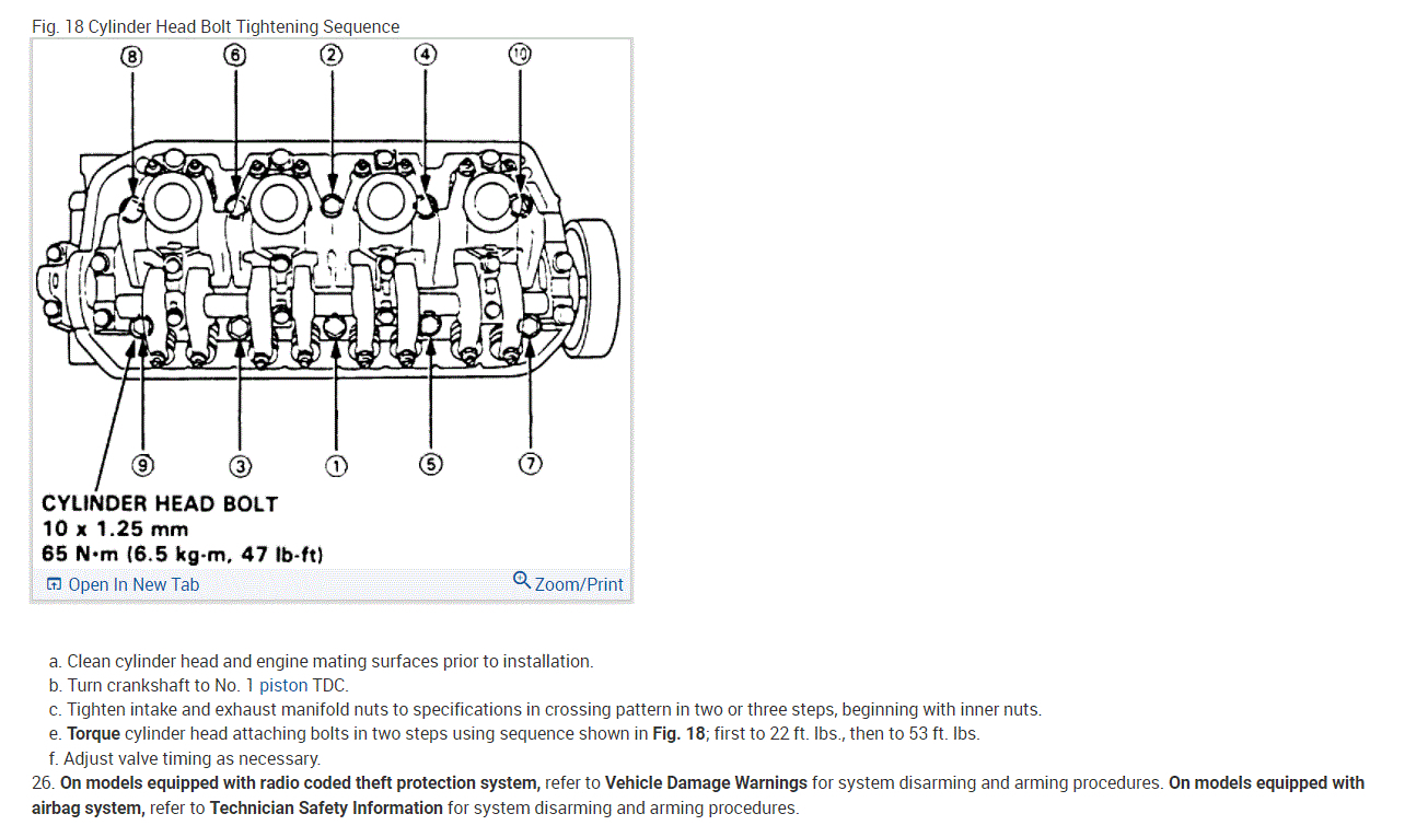 If we determine it is a head gasket, here are the directions for replacement. The pictures below show both the directions and pics for doing the job. Pics 1-3 show the removal and replacement of the cylinder head. You will also need to remove and replace the timing belt to remove the head. The remaining pics correlate with timing belt replacement. This is a good time to replace the belt and its components.