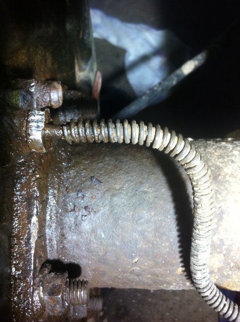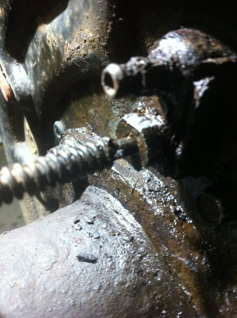 Now that you have been properly warned, do not even waste your valuable time trying to solve the nut problem. Even if you do get it loose in the wheel cylinder, it will be rusted to the line, and the line will twist off. Do you really want to reinstall that nut? Cut the line right next to the wheel cylinder only if that is necessary to get the wheel cylinder off. Cut the line on its other end where it most likely is attached to the brass block at the end of the rubber flex hose. That will be on top of or next to the rear axle's center section. Cut that line real close, because the next step is to pound on a six-point socket. Line nuts are very soft. They will deform easily to allow the socket to be driven on. If all you have is a 12-point socket, stop right there and find a 6-point. No sense making more frustration for yourself. Even if the truck is real rusty, this nut will come loose very easily because it is screwed into brass.