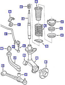 Example on the front, not just the strut but the coil spring bumper, coil spring seat, coil spring insulator, strut mount bearing support and the strut mount.