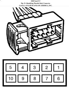2 . Disconnect throttle body electrical connector. Connect SST 86 11 857 test light (see Fig. 9) or equivalent to throttle body harness connector terminals No. 5 (Grey/Red wire) and 10 (Blue/Red wire). See Fig. 21. Connect TECH 2 scan tool to Data Link Connector (DLC). Turn ignition on. Select ACTIVATE: THROTTLE MOTOR PWM test. The test light should alternate between green and red. If test light does not operate as specified, check for faulty circuit between throttle body harness connector terminal No. 5 and ECM harness connector terminal No. 48 (Grey/Red wire). See Fig. 1, Fig. 3 or Fig. 5 for ECM location. See Fig. 11 for ECM terminal identification. Check for faulty circuit between throttle body harness connector terminal No. 10 and ECM harness connector terminal No. 24 (Blue/Red wire). See appropriate wiring diagram in WIRING DIAGRAMS article. Repair as necessary. If test light does operate as specified, replace throttle body. Go to next step.