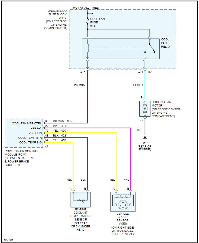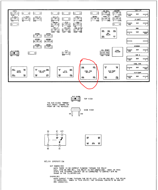 The cooling fan runs all the time from the time you start the engine until you turn it off. When I first bought the car the fan didn't run but the heater and stereo didn't work now while installing the stereo I found the constant hot under dash and it appeared to be missing a wire that had been connected befor and the was a loose red wire hanging si I hooked it up and heater started to work but fan came on as well. So i'm pretty sure that the wiring for the fan motor isn't correct or something of that nature but i'm not sure what it should look like under there so I don't know can you please help me with a wiring diagram or somthing hell even a picture would work