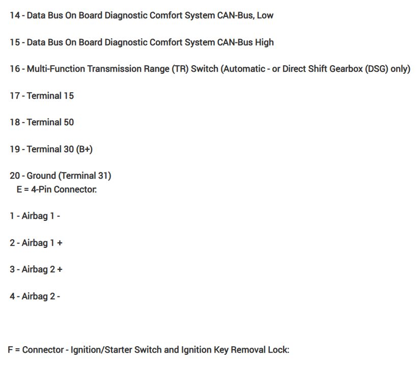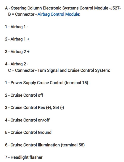 Having said that, I am still looking for the pinouts of the two connectors on the “steering column control module”, what VW calls J527, and in my case, model 1K0-953-549-AJ.