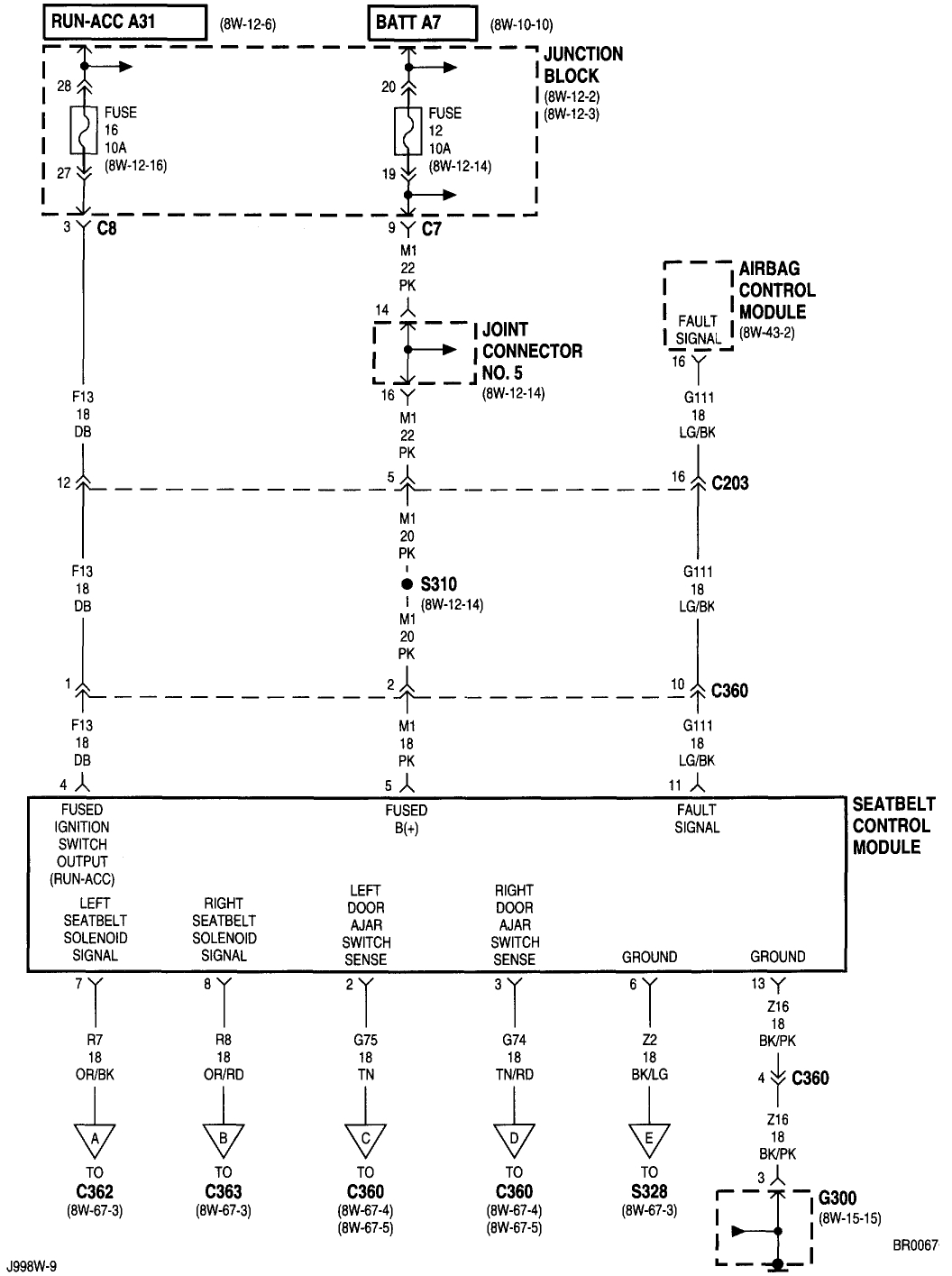 Both seat belts will not release. I checked the wiring to the seat belt control module and found no current (*or voltage) across the pink and green/black. I did not get anything across the fuse sets either. I am thinking that I might not be getting power to the fuse. Is there a relay that sends this? Thanks. John